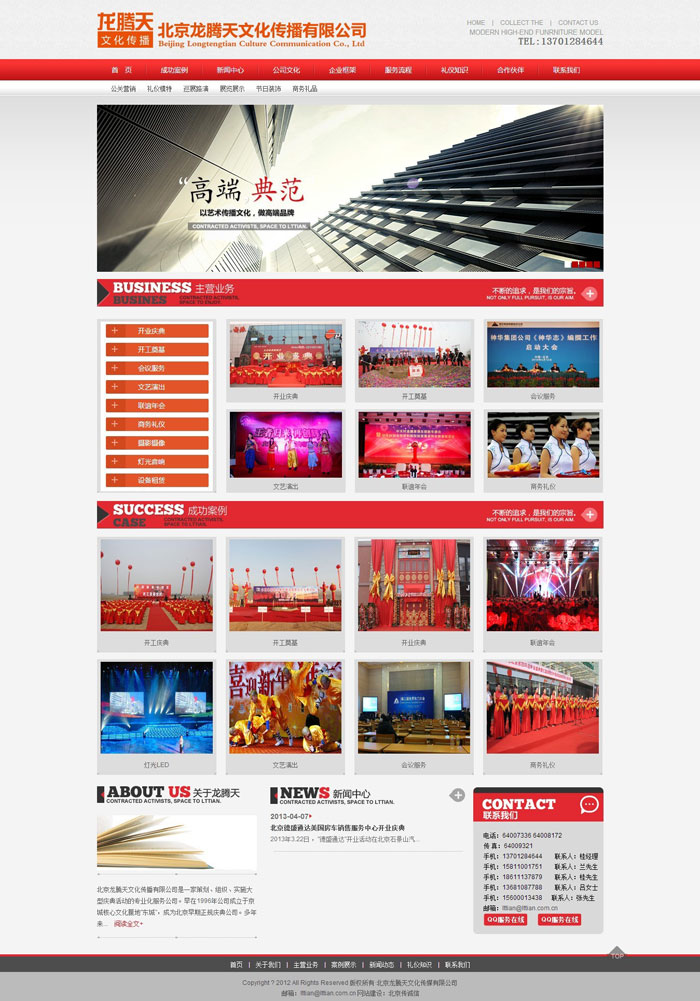 北京龍騰天文化傳播有限公司是一家策劃、組織、實施大型慶典活動的專業(yè)化服務(wù)公司。早在1996年公司成立于京城核心文化腹地"東城",成為北京早期正規(guī)慶典公司。多年來,我公司本著"傳播文化,服務(wù)于社會"的經(jīng)營理念,和"為企業(yè)樹立完美形象,提高其社會影響力"的宗旨,不斷積累經(jīng)驗和發(fā)展壯大走出了一條以誠信為原則以特色求發(fā)展的創(chuàng)業(yè)之路。我公司精英云集,現(xiàn)已擁有慶典部、演出部、策劃部、工程部、財務(wù)部、行政部等部門。我們以精湛的技術(shù)、真誠的服務(wù)、精彩的創(chuàng)意為國內(nèi)外眾多企事業(yè)單位承辦了數(shù)以千計的各類慶典活動,其承辦的內(nèi)容豐富多彩、高雅完善,擁有了相當(dāng)?shù)膶嵙εc水平。歡迎各界人士、新老朋友前來洽談業(yè)務(wù)。能為您的企業(yè)更加輝煌出一份力,是我們龍騰天文化傳播有限公司全體職工的心愿!