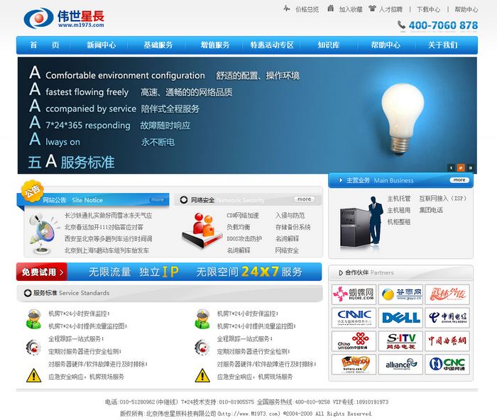 偉士星辰公司致力于為廣大客戶提供優質的互聯網一站式服務,服務范圍涵蓋網站建設、域名注冊、網站空間(虛擬主機)、企業郵局、數據庫、服務器托管與租用、服務器網絡安全、服務器流量監測等;基于與中國電信、中國聯通是合作伙伴的便利條件,我們還代理了中國電信、中國聯通的400電話、IP長途電話等語音產品