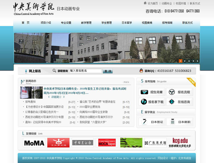 中央美術學院擁有一流的教學設備和和學術氛圍。在中央美院二年半和日本半年的學習,嚴格按照日本京都情報大學院大學動畫專業教學大綱實行教學和管理。從第二學年開始主要專業課程由日本京都情報大學院大學的教師定期來美院開展核心課程的教學。此外,日本大學的專家學者、大學代表定期訪問,交流工作,對學生進行講座宣傳,介紹在日本的生活學習、本專業的情況和其他大學同類專業的國際發展態勢,以開拓學生視野。中央美院重視培養學生的綜合素質,堅持把學風建設放在工作首位,依托動畫專業特色,樹立優良的學術氛圍和帶動學生整體的外語學習氛圍。堅持育人為本,以學比學,營造良好的育人格局。本項目教學嚴謹,管理嚴格,充分保障學生學有所得、學有所用和學有所長。