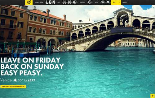 逃生飛行最大化利用令人驚嘆的攝影,其空間。這正是你想從一個旅游網站。它可以讓你的冒險等待著,精美的展示了驚人的目的地有點味道。當你將鼠標懸停在一個目的地,你會發現,正是你需要知道:門票價格,天氣狀況,飛行時間和行程長度。你還能有什么要求呢?
