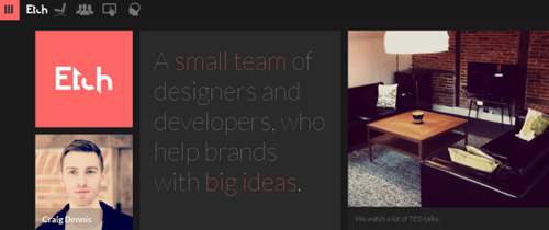 啊,良好醇'水平滾動!第二個故事的網站像一本雜志在平板電腦上的應用程序。它具有創新性的,因為它不具有一個典型的Web頁面的觸感和它水平滾動。的內容被布置在列中,每個部分垂直滾動。過導航錨定到左邊,這有助于建立的節奏。當您查看導航最大限度地減少這種組合,酒吧上空盤旋時,在左邊,再次出現。您可以選擇在縮略圖視圖或幻燈片查看投資組合。