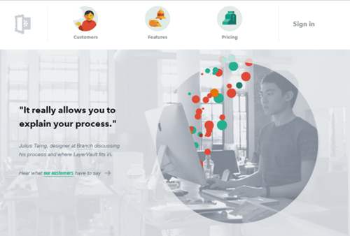 它是驚人的,可以有什么樣的影響,一個簡單,干凈的布局與俏皮的色彩和有趣的動畫。LayerVault平衡白色空間和微妙的動畫陰謀和從事用戶。動畫可以用來說明一個點,引導用戶通過一個網站,甚至說明了如何使用。動畫并不總是這樣的伎倆,,但LayerVault適用應謹慎,只有當用戶在瀏覽頁面的特定部分。結果呢?奠定了良好的頁面,耐看,有吸引力的插圖。