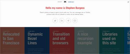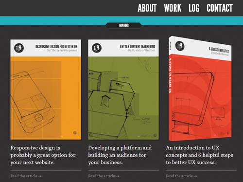 滾動通過這種大膽的設計簡單的文章,讓我想起了瀏覽書架。懸停效果為用戶挑出一篇文章的重點。這個網站上也有一個聰明的設計:當您點擊一個選項卡上的“關于”和“聯系”部分,頁面下降到透露的信息。這是一個簡單的方式提供信息,而無需重定向到另一個頁面。
