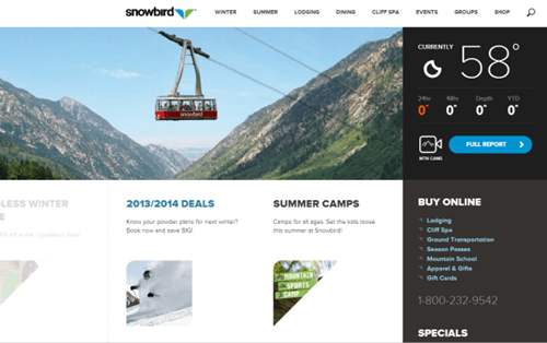 雪鳥是一個動態的網站,涉及用戶。顯示當前的天氣,當你將鼠標懸停在折疊,揭示本周預測?!巴暾麍蟾妗卑粹o懸停效果是潛移默化的,因為它變換成直角,圓角尚未生效。玩笑是三角形的,看起來像一種雪鳥的翅膀;上空盤旋時,他們獲得較大視圖展開成一個正方形。