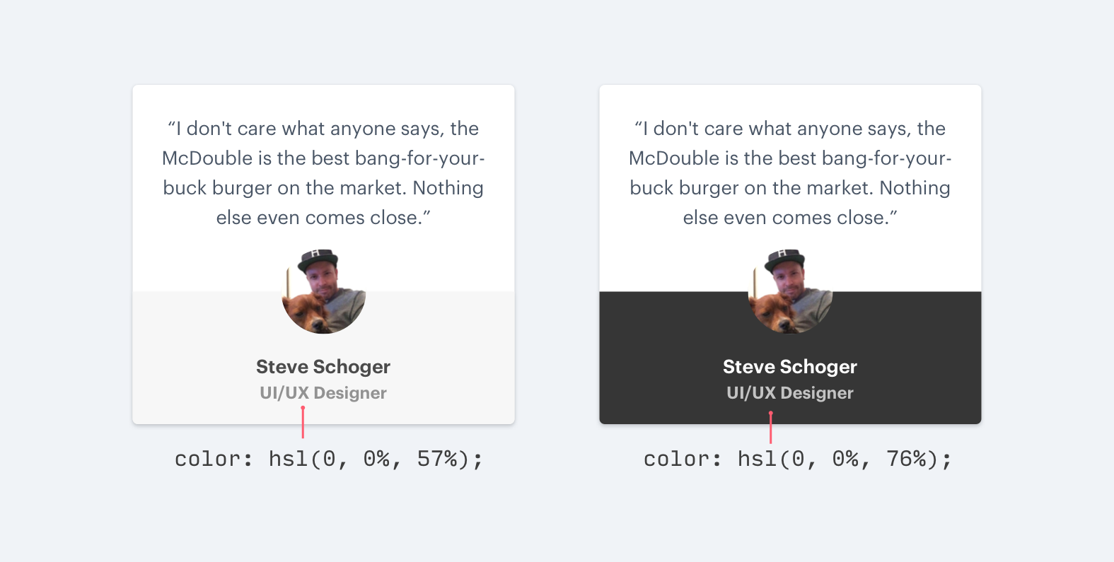 在白色背景下,將黑色的文本改成灰色,是不錯(cuò)的淡化其視覺效果的做法,但是在彩色背景下這么做,則是另外一回事。