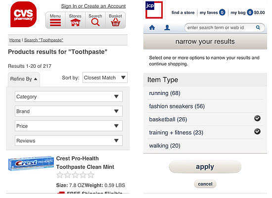 CVS使用下拉菜單中的“篩選”選項卡中進行篩選。選擇一個菜單選項,將立即對結果進行篩選。JC Penney公司提供了一個下拉列表中,選擇過濾器和顯示產品的數量相匹配的過濾器值。JC Penney公司也可以在一個屏幕上,貿易是購物者點擊“應用”按鈕被選中多個值從一個方面。