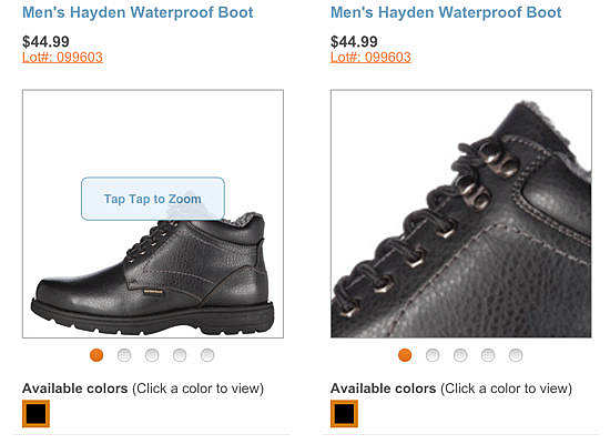 Payless使用一個swipeable的畫廊,從不同的角度,以顯示其產品。用戶也可以點擊放大才能看到細節,如縫合和扣眼。