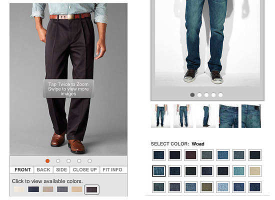 碼頭工人(上圖左)有一個swipeable照片畫廊,雙,挖掘到放大的細節的,消費者可以看到一個產品在不同的顏色。列維的(右上圖)采取了類似的做法,加上縮略圖的表示照片在畫廊的角度。泊塢窗“網站上選擇一個新的顏色會導致整頁刷新,而李維斯沒有。