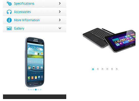 三星(左上圖)和戴爾(上圖右)都使用他們的產品swipeable照片畫廊。三星采用了畫廊到的手風琴在其產品上,而戴爾使用一個單獨的頁面。