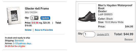板條箱和桶(左上圖),允許用戶刪除產品,保存到收藏夾和更新數量的表中的行。每一行還包括運輸成本和交貨時間等信息。Payless(右上圖),也可以讓消費者更新的數量和刪除項目,它的車還提供了一個選擇的交付選項,包括將產品送到一個Payless專賣店(未顯示)。