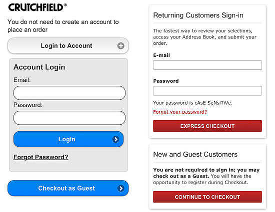 克拉奇菲爾德和諾德斯特龍都允許客戶檢查作為嘉賓或通過使用他們現有的帳戶。讓手機購物已簽出作為嘉賓把他們的訂單后,創建一個帳戶和密碼重置都支持。
