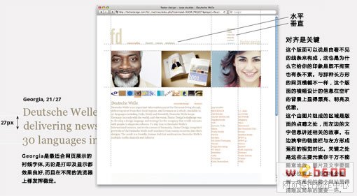 這個版式結(jié)構(gòu)我們有兩點是特別欣賞的:一是它采用了印刷類的平面設(shè)計風格,使用襯線字體,文字顏色對比低調(diào)柔和,不同文字欄寬度形成強烈對比。二是上面的水平圖片區(qū)域設(shè)計,使整個版面顯得優(yōu)雅漂亮。這個圖片區(qū)域只看上一眼,你可能不能一下子認識它的所有優(yōu)點,但我們之所以深入討論這個區(qū)域是因為如果從技術(shù)上來說,你采用了同樣這種方法,就可以得到同樣漂亮的相似效果——無論是網(wǎng)站設(shè)計還是其它平面設(shè)計。看一下我們能夠從這個網(wǎng)站設(shè)計中學到什么。