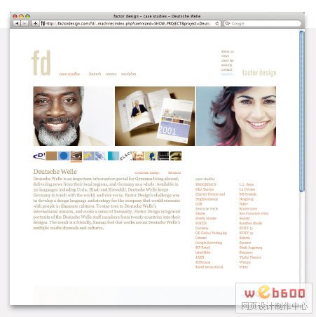 Factor Design網(wǎng)站令人一見難忘,其版面結(jié)合了作品展示及手冊設(shè)計的特點形成漂亮的效果。白色的開闊區(qū)域,高度簡潔及最小化的構(gòu)成,柔和的顏色搭配,通過一些隱藏的表格整潔清晰地呈現(xiàn)出來。